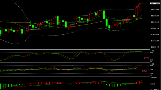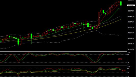 黄金周线图上,金价连续第三周上涨,均线指标多头排列,STO指标金叉向上,RSI指标金叉,MACD金叉,红色能量柱放量增大,不过布林带上轨限制了黄金继续上涨的空间,显示金价虽然涨势强劲,但存在遇阻调整的风险。