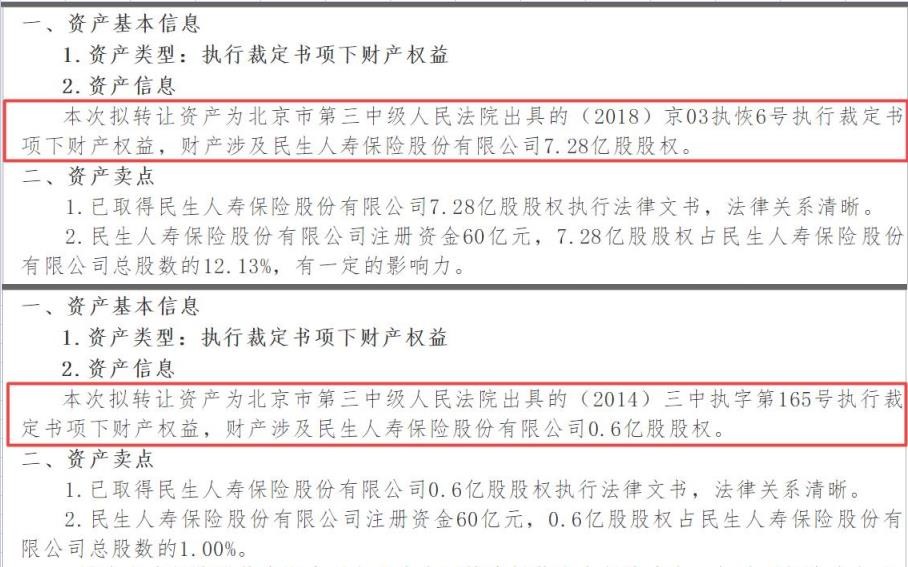 2021年11月17日,北京产权交易所公布两则生效执行裁定书项下财产权益,共涉及民生保险7.88亿股股权,占总股本的13.13%。