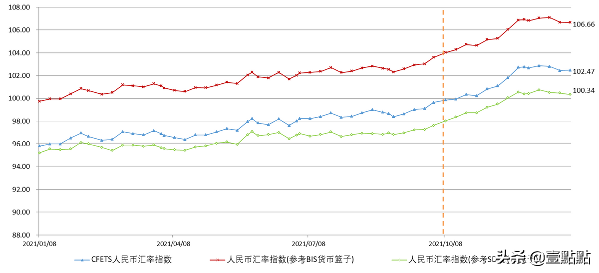 12月31日,CFETS人民币汇率指数收于102.47,升值幅度为2.84%;较2020年末上升7.63,全年升值8.05%。人民币汇率指数(参考BIS货币篮子)收于106.66,较2020年末升值8.09%;人民币汇率指数(参考SDR货币篮子)收于100.34,较2020年末升值6.48%。