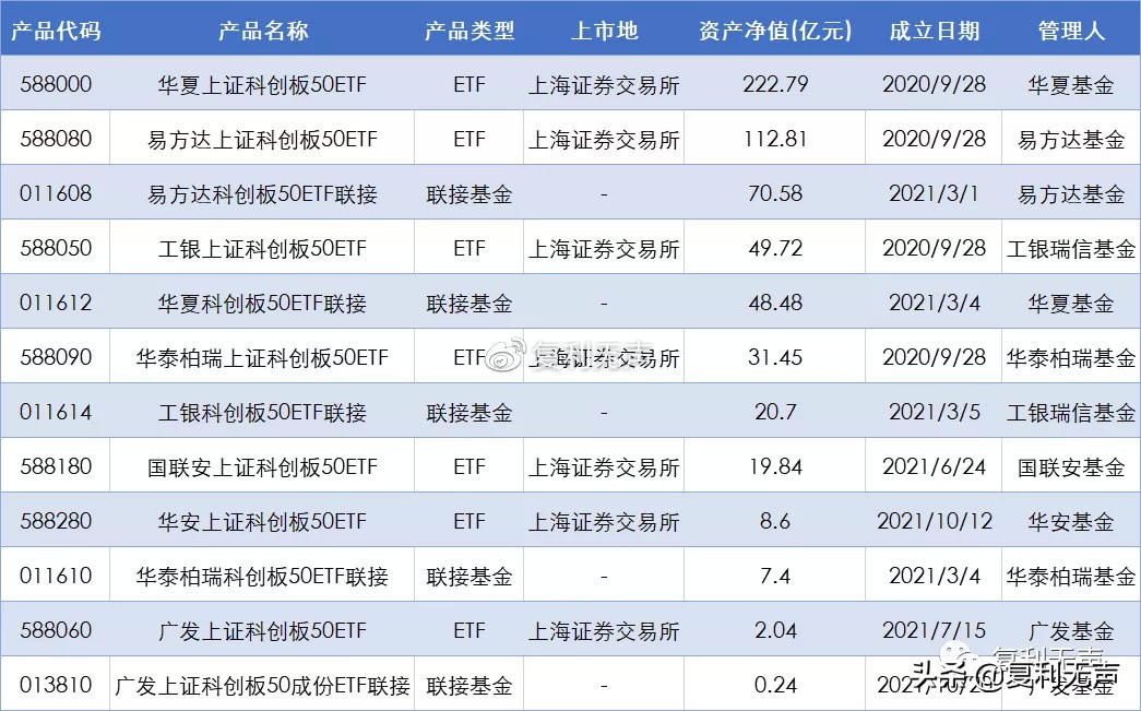 上图是目前境内上市的所有科创50指数关联基金,其中华夏、易方达、工银和华泰柏瑞是首批4家获得科创50ETF发行资格的基金公司,