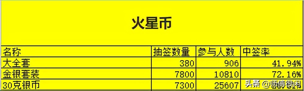 火星币金银套装中签率达到了72.16%,大全套中签率达到了41.92%,30克银币中签率达到了28.51%。从这次的中签率也可以看出火星币目前的市场情况,基本上都是处于一个破发的状态,所以这次抽签完以后,火星币的市场情况将进一步下探,至于到什么地步,目前来说也不好确定。
