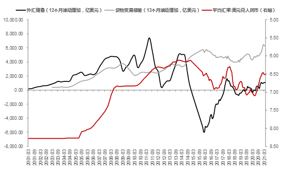 中泰策略分析师张文宇从国际收支视角看支撑人民币升值的逻辑,他认为,人民币汇率短期震荡走强的概率较大,主要原因还是中国较强的出口韧性支撑的贸易顺差高位、中国实体投资回报率提升对外汇的吸引力。外汇市场上的大多数的交易都是资产性的,而短期内市场对人民币升值预期也会进入“预期自我实现”的环节。 从国际收支角度,外汇供求结果主要反映在两方面:经常账户,即进出口贸易顺差“吸收”,资本和金融账户,即国内企业或部门跨境投资“流出”。全球不规则复苏背景下,中国出口的强劲出现了明显的“顺差不顺收”的加剧现象。整体来看,贸易顺差实际带来的资金流入规模仅为顺差的42%,较疫情前44%的低位,下降2个百分点。同时,央行的外汇储备增加的幅度也远不及商业银行结售汇顺差规模。2020Q3至2021Q1商业银行结售汇顺差从107亿扩大至940亿美元,而同期外汇储备仅增加274亿美元。