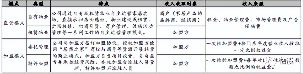 具体模式上,居然之家通过直营+加盟的方式进行门店扩张,直营模式是居然之家通过自有或租赁物业自主运营家居卖场,直接承担店面选址、物业建设或租赁、卖场装修、招商引领、商户管理、促销活动管理等一系列工作的自主运营管理模式,收入来源于商户缴纳的租金、物业管理费、市场管理费以及广告促销费等。而加盟模式是居然之家与加盟方签订加盟协议,授权加盟方使用“居然之家”的商标与商号货源等开展经营的商业模式,收入来源为加盟方缴纳的加盟费及权益金(每年经营结果的比例向居然之家支付)。居然之家的加盟模式可以分为委托管理加盟及特许加盟两种,一般居然之家委派总经理、财务经理与业务经理对委托管理加盟店进行管理,但对于特许加盟店公司则不会派驻管理人员。