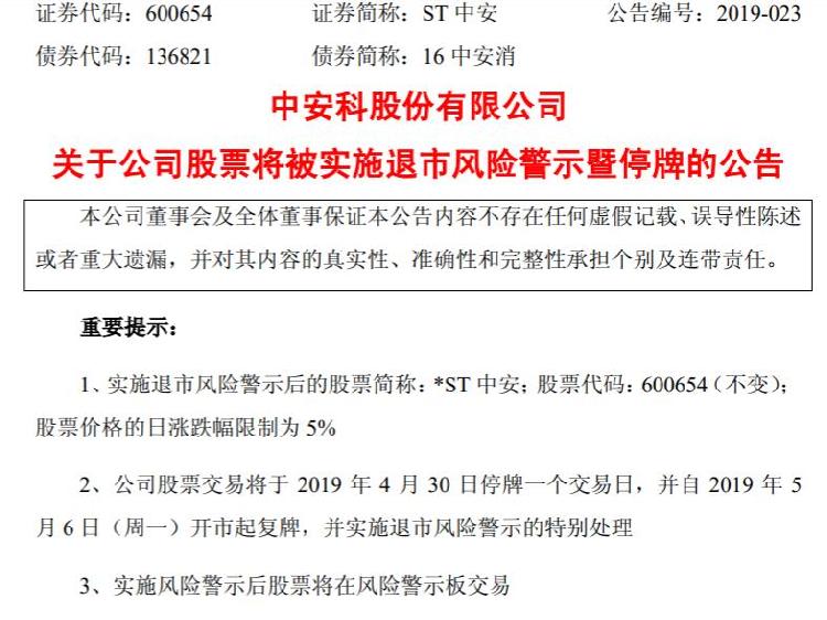 中安科股份有限公司(以下简称“公司”)经审计的2017年度、2018年度归属于上市公司股东的净利润连续为负值,根据《上海证券交易所股票上市规则》13.2.1 条第(一)项的规定,公司股票将在2018年年度报告披露后被实施退市风险警示(*ST)的特别处理。公司股票交易已于4月30日停牌,并自2019年5月6日(周一)开市起复牌,并实施退市风险警示的特别处理。