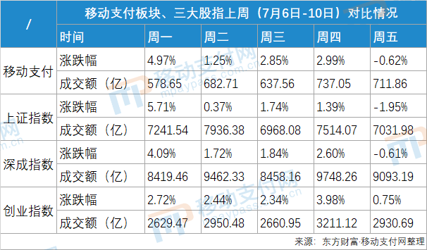 与三大股指走势类似,7月6日-10日5个交易日中,移动支付板块整体上涨,日均涨幅2.288%。成交额合计3327.83亿元,日均669.6亿元。