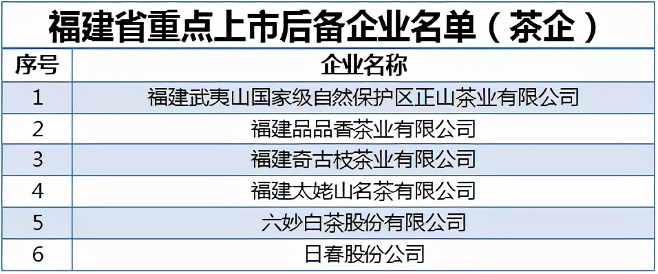 首批入选福建省重点上市后备企业名单的茶企是:福建武夷山国家级自然保护区正山茶业有限公司、福建品品香茶业有限公司;第二批是:福建奇古枝茶业有限公司、日春股份公司、福建太姥山名茶有限公司、六妙白茶股份有限公司。福建现有6家茶企入选福建省重点上市后备企业。(详见下表)