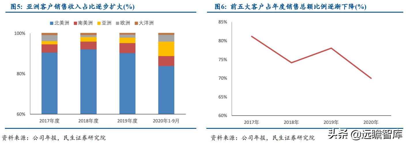 公司的生产技术、产品性能和质量在海外市场具备一定的品牌效应,客户结构逐步优化,前五大客户占年度销售总额比例逐渐下降。